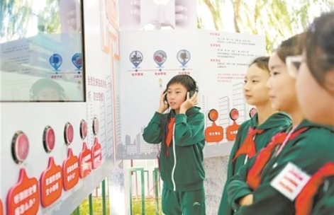 北京市国动办在陶然亭公园牵头开展国防动员宣传教育活动。图为该市安外三条小学学生试听防空警报。王 圣摄
