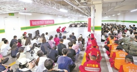 山西省晋中市国动办组织多所学校开展防空袭疏散训练。图为山西工程科技职业大学学生,在地下人防工程中学习心肺复苏方法。李 枫摄