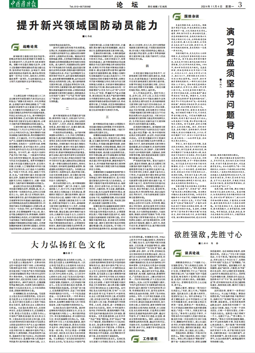 习主席在出席十四届全国人大二次会议解放军和武警部队代表团全体会议时指出:“要强化使命担当,深化改革创新,全面提升新兴领域战略能力”“大胆创新探索新型作战力量建设和运用模式,充分解放和发展新质战斗力”。随着信息化智能化战争的科技含量越来越高,科技已成为核心战斗力。新兴领域是科技密集型领域,已成为国际竞争的前沿阵地和捍卫国家安全的关键战场,必须大力提升新兴领域国防动员援战能力。