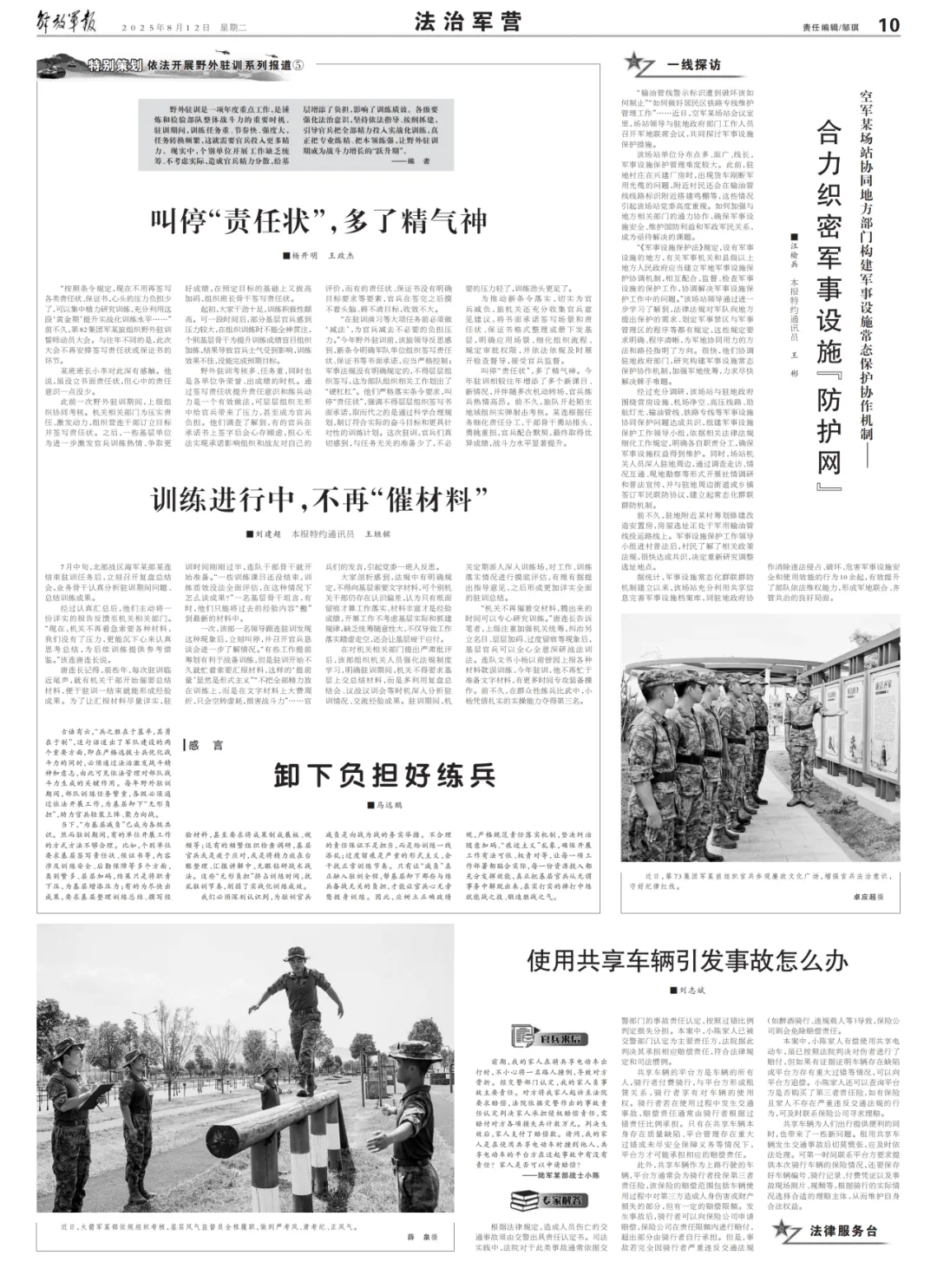 “《军事设施保护法》规定,设有军事设施的地方,有关军事机关和县级以上地方人民政府应当建立军地军事设施保护协调机制,相互配合,监督、检查军事设施的保护工作,协调解决军事设施保护工作中的问题。”该场站领导通过进一步学习了解到,法律法规对军队向地方提出保护的需求、划定军事禁区与军事管理区的程序等都有规定,这些规定要求明确、程序清晰,为军地协同用力的方法和路径指明了方向。很快,他们协调驻地政府部门,研究构建军事设施常态保护协作机制,加强军地统筹,力求尽快解决棘手难题。
