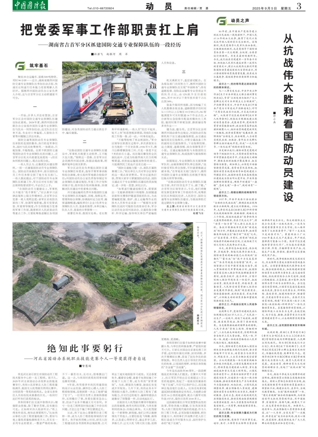 80年前,在中国共产党倡导建立的抗日民族统一战线旗帜下,中国人民以14年的血火抗争,赢得了近代以来反抗外敌入侵的首次完全胜利。这场胜利,既是党领导人民军队浴血奋战、打败强敌的胜利,也是党领导下国防动员体系第一次大规模、全纵深、全要素运行的胜利。历史是最好的教科书。今天,我们站在实现建军一百年奋斗目标、加快把人民军队建成世界一流军队的重要关口,理应从抗战伟大胜利中获取国防动员建设深刻而宝贵的启示,用以推动国防动员高质量发展,使其成为打赢战争、遏制战争的重要保障力和威慑力。