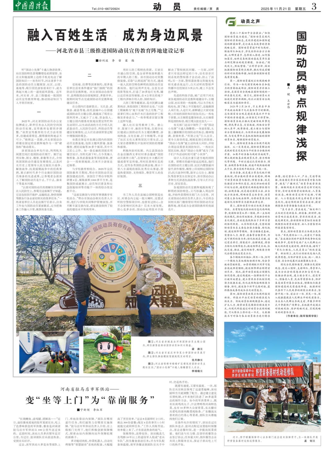 深化全民国防教育,增强全民国防观念,使关心国防、支持部队、尊崇军人成为全社会的思想共识和自觉行动。依据法律法规,建立健全军人、退役军人、预备役人员、民兵等荣誉体系,维护各类动员对象合法权益,增强他们投身国防建设的光荣感使命感。把握新时代条件下人民战争的新特点新要求,坚持平战一体、前后方一体、军民一体,深入挖掘蕴藏在人民群众中的优质潜力,为未来人民群众参战支前、开展多种形式斗争提供广阔舞台,系统提升我国应对战略风险、维护战略利益、实现战略目的的整体实力。
