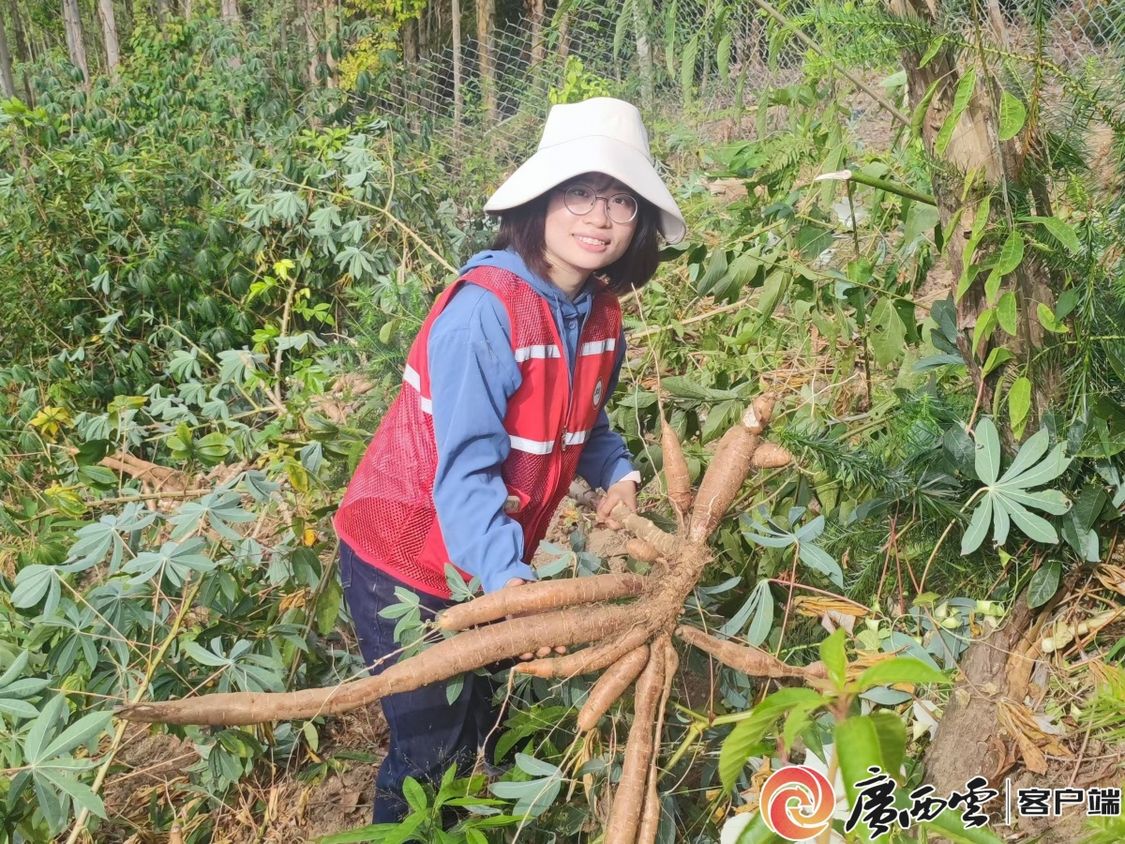 唐依琦在协助村民收木薯。受访者供图