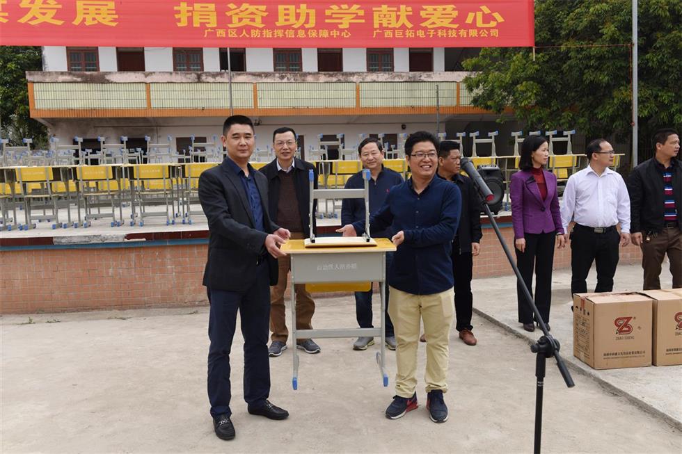13日上午,自治区人防办副主任周卫一行来到东平镇火甲小学、富山小学,将价值5万元的200套课桌椅和500多套学习用具送到师生们手中,此项活动由自治区人防指挥信息保障中心党支部发起,他们积极组织党员同志捐款,并与广西巨拓电子科技有限公司党支部联系协调,号召争当爱心企业,争做爱心党员,齐心协力为贫困学生奉献爱心,这一善举得到了广西巨拓电子科技有限公司党支部的积极响应和大力支持,此次捐赠活动对发挥党支部组织参与扶贫共建、促进农村文化建设起到了较好的示范带头作用。