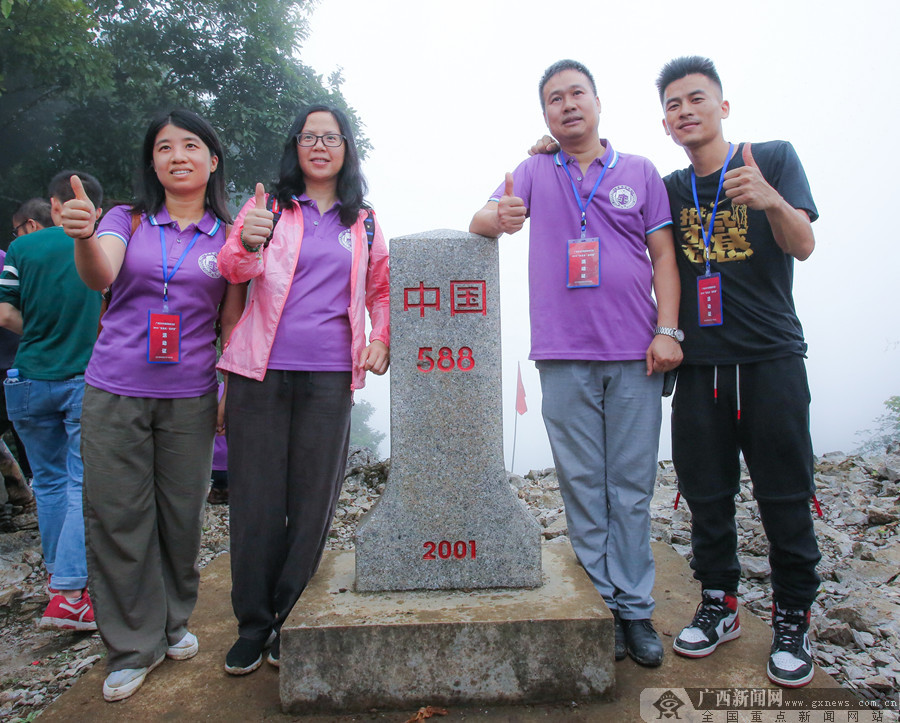 主题活动采访团在588界碑旁合影留念。广西新闻网记者 廖志荣 摄