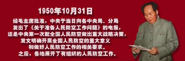 1950年10月31日,周恩来总理召集聂荣臻、薄一波等同志研究全国的防空问题,这是中央首次研究全国的人民防空工作;当日,经毛泽东主席批准,中央致电各中央局、分局《关于准备人民防空工作问题》,这是中央第一次发文明确开展全国人民防空的重大意义和做好人民防空工作的相关要求。之后,全国范围内展开了有组织的人民防空工作。