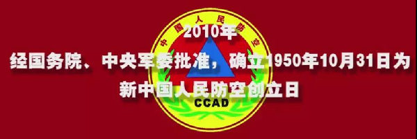 2010年7月10日,经国务院、中央军委批准,国家人防办确定1950年10月31日为新中国人民防空创立日。