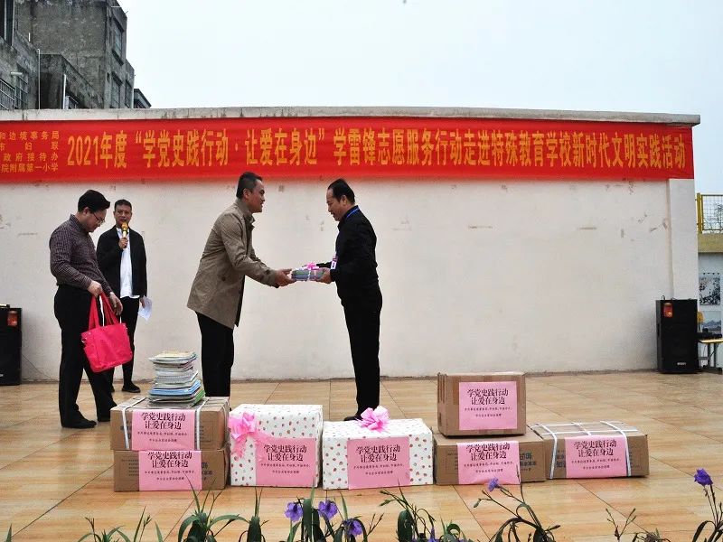 活动当天,崇左市外事和边境事务局代表各组织单位向崇左市江州区特殊教育学校捐赠了一批儿童绘本、书包、笔袋、防晒衣等必需物品。广西民族师范学院附属第一小学同学现场表演三句半《雷锋叔叔,我爱你》和手语操《你笑起来真好看》。活动结束前,广西民族师范大学附属第一小学同学还与特殊教育学校的学生一同开展体育竞技活动并赠送绘画作品,建立了互助友爱的友好情谊。