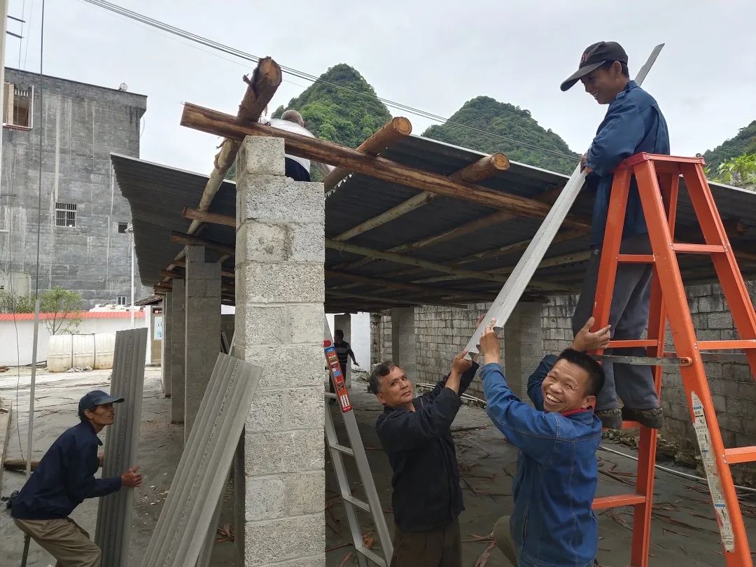 为推进巩固拓展脱贫攻坚成果同乡村振兴有效衔接,满足村民对精神文化生活需求,近日,百色市人防边防办驻德保县艾屯村工作队筹资购置水泥、砂浆、砖瓦、钢筋等建材,组织村干群众投工投劳,共同修建群众休闲文化广场和村部食堂。大家自带工具,争先恐后投入劳动,施工现场其乐融融,人人喜笑颜开。