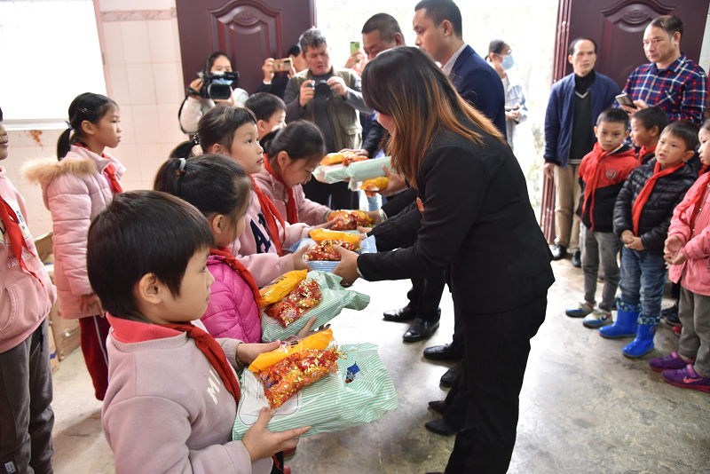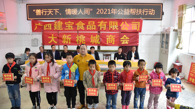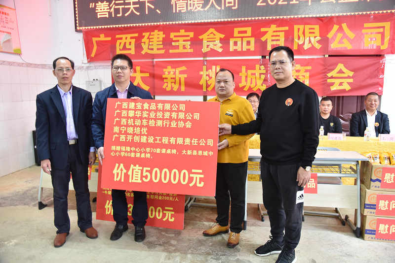 为切实把党史学习教育成果转化成为民办实事的实际行动,进一步巩固脱贫攻坚成效,助力乡村振兴。11月1日,自治区人防边海防办牵线广西大新桃城商会、广西建宣食品有限公司等多家爱心企业到崇左市大新县福隆中心小学开展“善行天下、情满人间”2021年公益帮扶活动。爱心企业共为隆福、恩城两所中心小学捐赠一批课桌椅、学习生活用品及部分困难学生慰问金,总价值8万元。