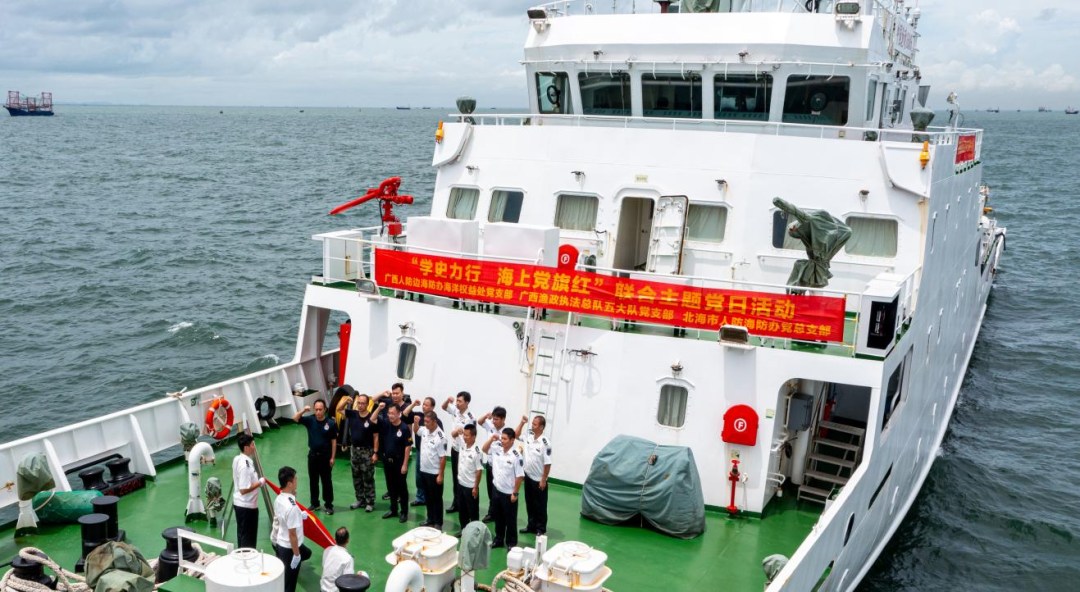 为深入学习贯彻习近平总书记在庆祝中国共产党成立100周年大会上的重要讲话精神,扎实推进党史学习教育,8月16日,自治区人防边海防办海洋权益处党支部与广西渔政执法总队五大队党支部、北海市人防海防办党总支部,在北海联合开展“学史力行 海上党旗红”主题党日活动。办党组成员、副主任黄小宁同志参加主题党日活动。