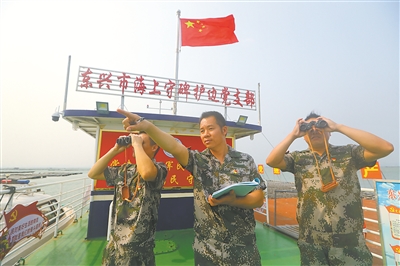 在海上守碑护边党支部所在的蚝排上,苏世艺(中)和护边员们正在观察附近海域情况。李东岳摄