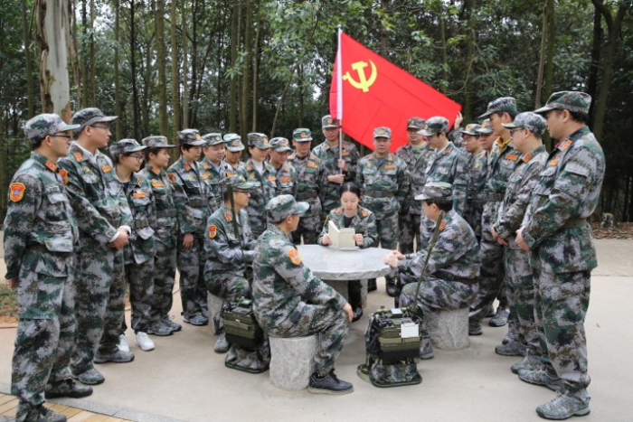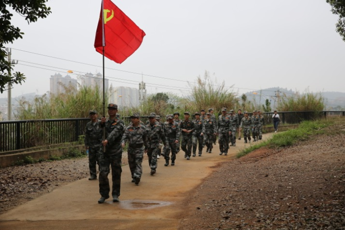 3月的南宁春寒料峭,细雨蒙蒙,全体参训人员身着迷彩服、党员佩戴党员徽章,徒步攀登五象岭。拉练途中大家相互鼓励、相互帮助,没有一名队员掉队,展现了广西“人防人”强烈的使命感、责任感和积极向上的团队精神。