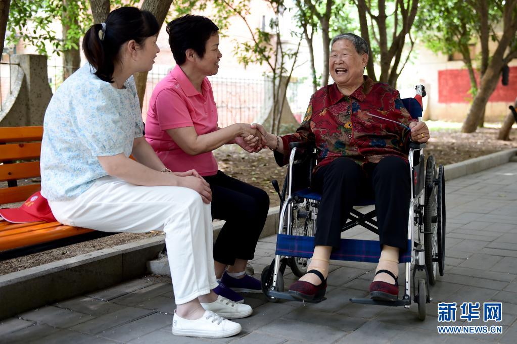 6月9日,在安徽省合肥市蜀山区西园街道,马毛姐(右一)和社区居民交谈。新华社记者 黄博涵 摄