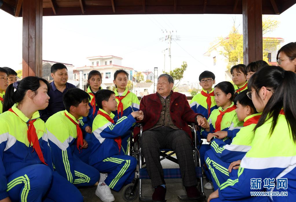 3月28日,马毛姐回到家乡安徽省无为市刘渡镇马坝村,给家乡的学生们讲述当年的战斗经历。新华社发(郑远 摄)