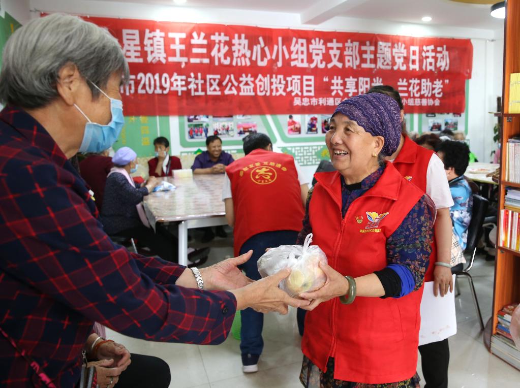 王兰花(右)向来到兰花志愿服务站参加活动的老人发放“爱心水果”。(2020年6月23日摄)新华社记者贾浩成摄
