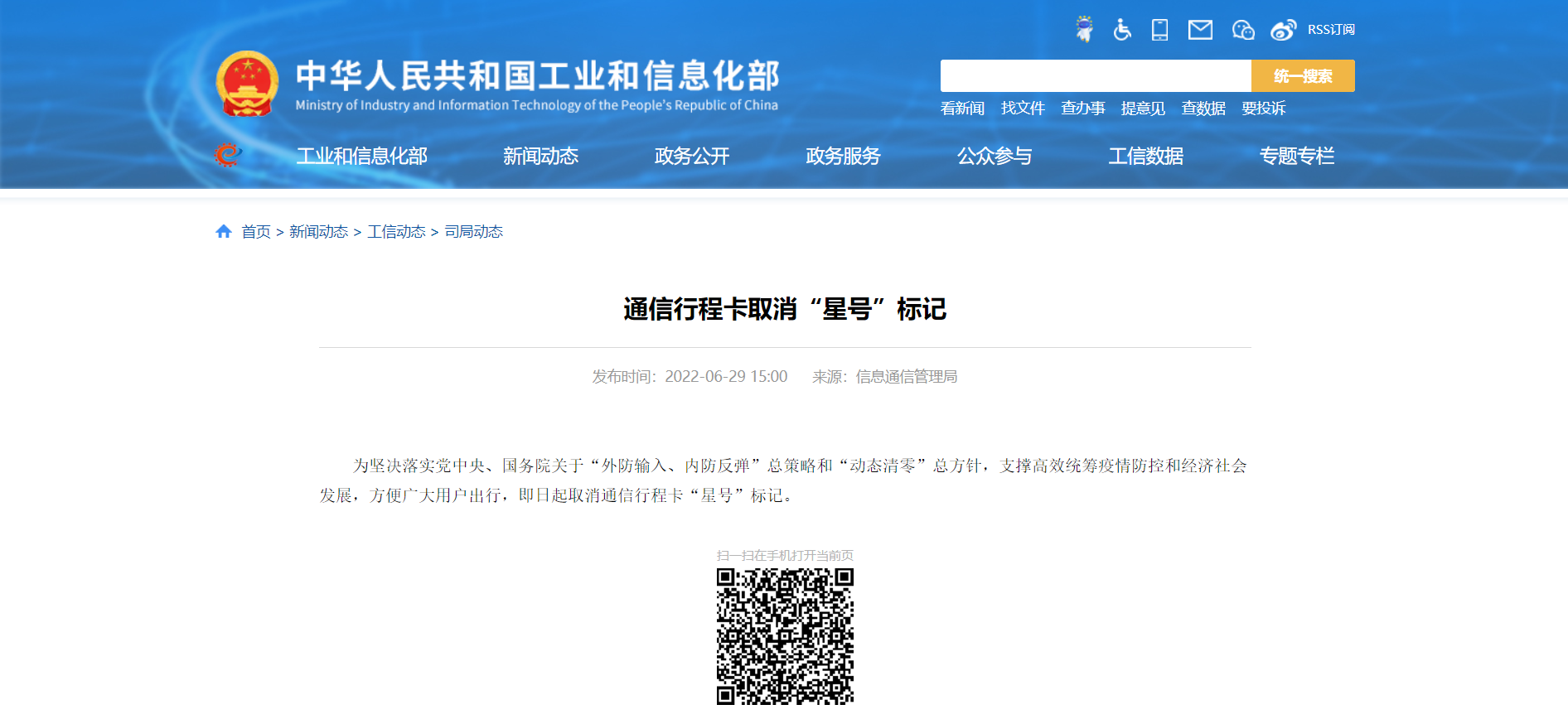 工信部29日发布公告,即日起取消通信行程卡“星号”标记。