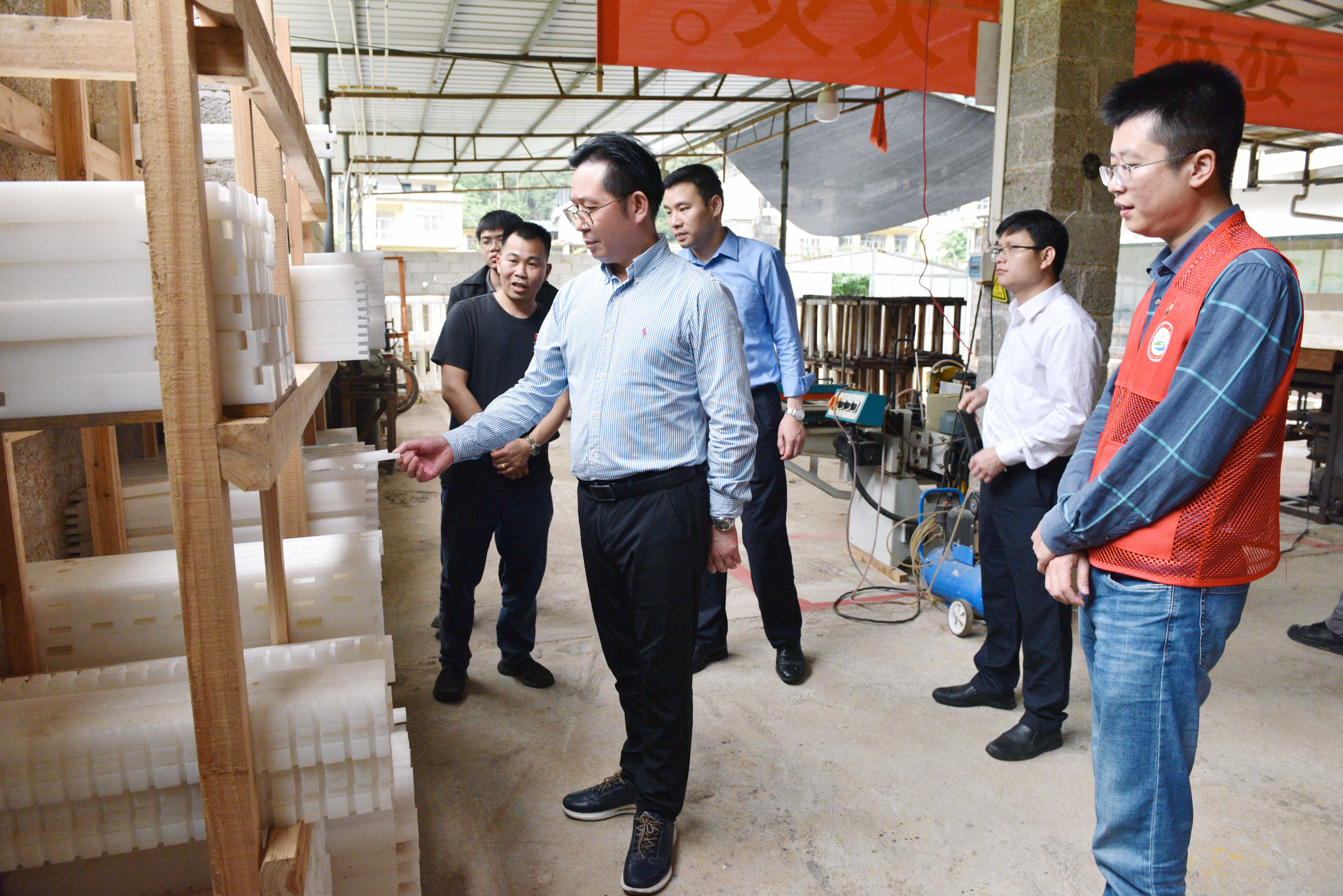 图为韦绍仕在仁益村弄欣屯益欣木材加工厂调研