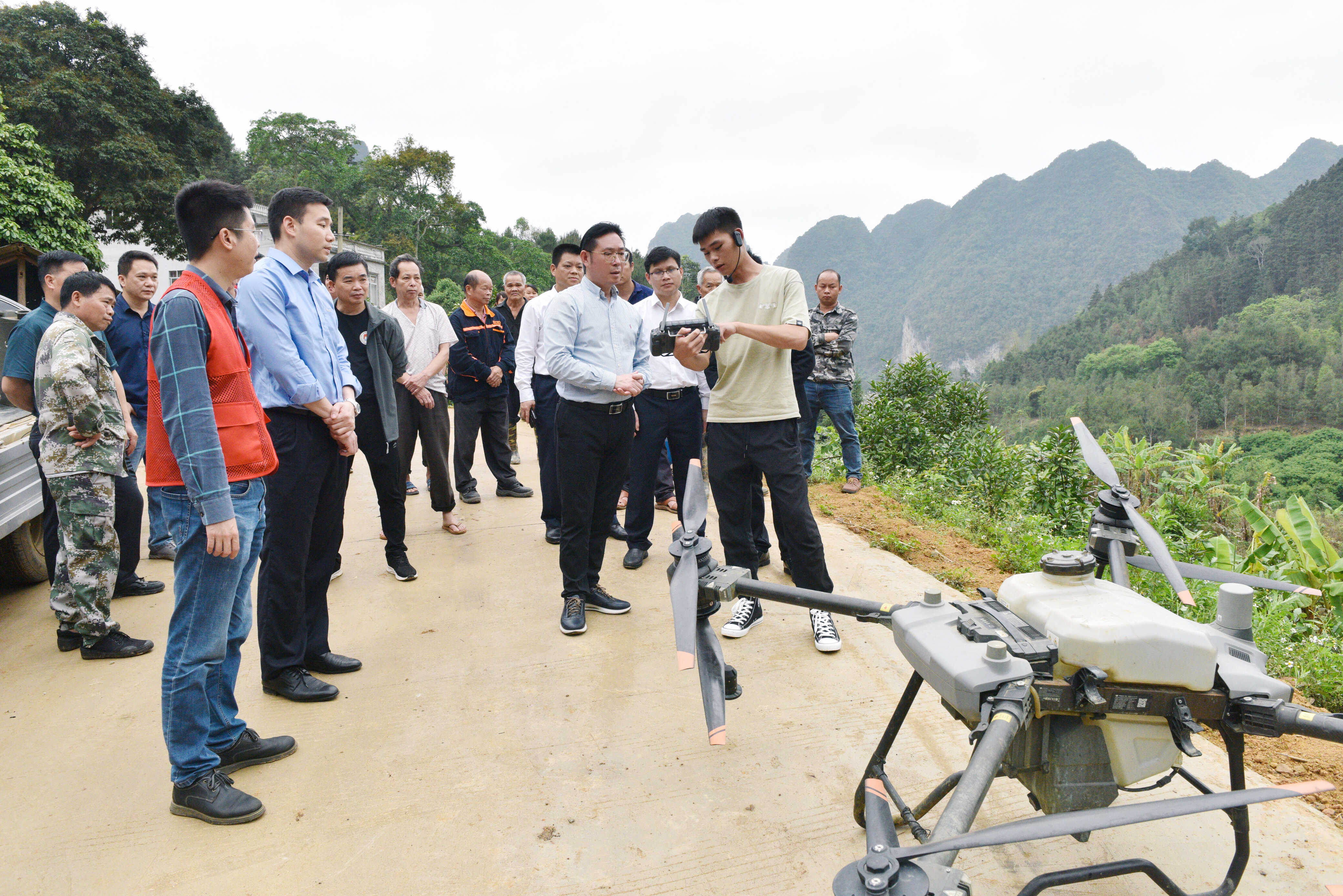 图为韦绍仕在仁益村上吞屯观摩无人机喷洒农药作业