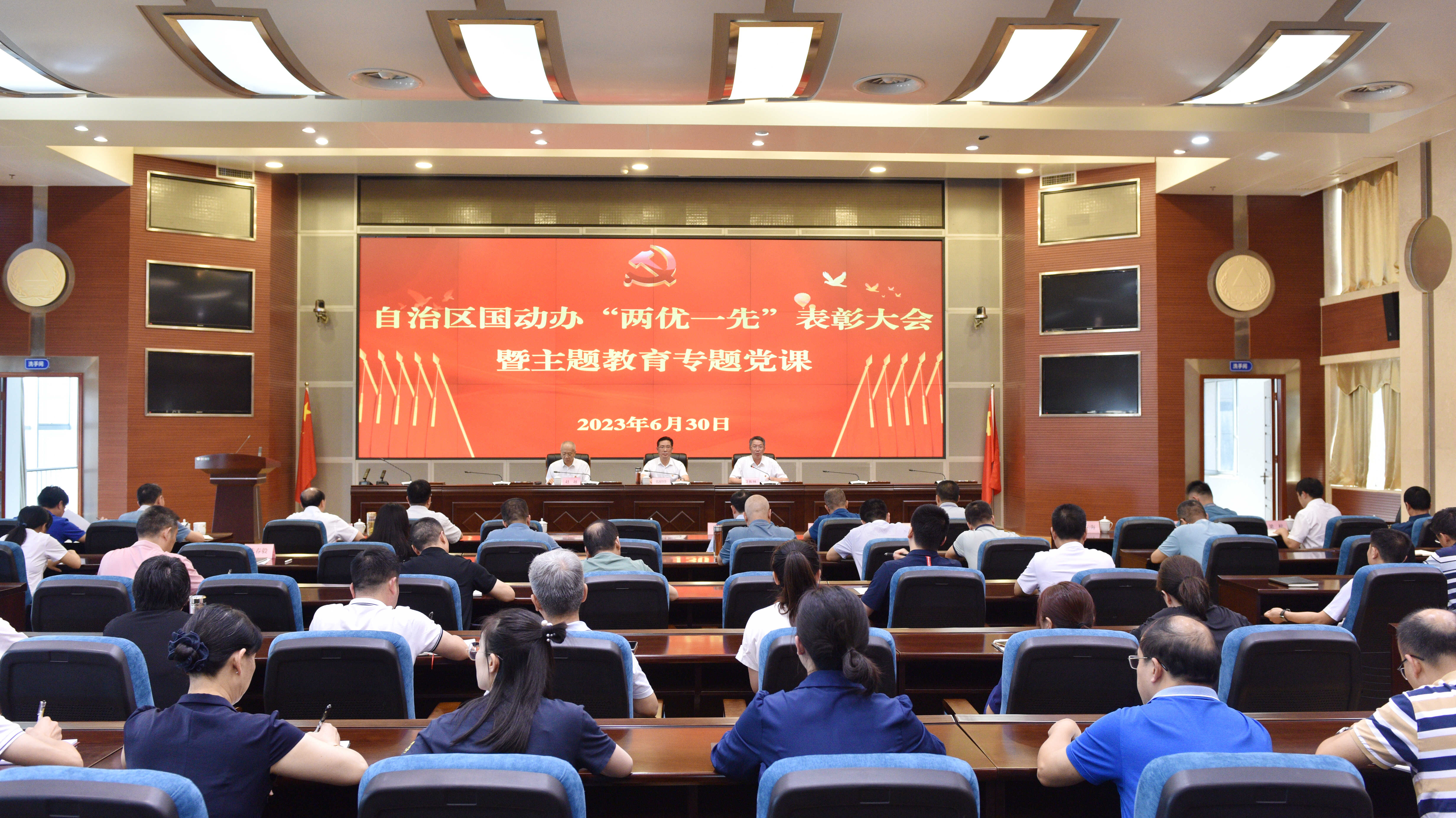 为庆祝中国共产党建党102周年,进一步激励各级党组织、广大党员干部充分发挥战斗堡垒作用和先锋模范作用,努力推动全区国防动员和国防战备工作再上新台阶,6月30日,自治区国动办举办“两优一先”表彰大会暨主题教育专题党课。办党组书记、主任韦绍仕出席会议并讲授专题党课。自治区党委主题教育第四巡回指导组莅会指导。办党组成员、副主任夏振林主持会议。