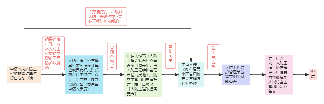 对确需穿墙打孔、破坏人防工程结构、影响人防工程防护功能、影响人防设备使用的,按照危害人民防空工程安全和使用效能的施工项目程序办理,须填写《人防工程自用充电设施安装申请表》,由人防工程维护管理单位委托原设计单位或具有相应资质的设计单位设计并出具施工图,审图合格后,报请属地人民防空主管部门批准后实施,竣工后填报《人防工程改造备案表》。