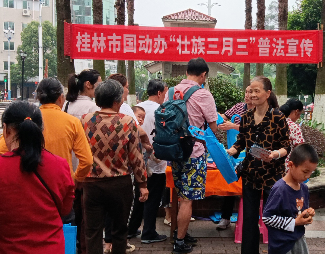 近年来,“广西三月三”节庆活动越来越红火,已经成为本地最重要的群众性大型文化活动之一,桂林市国动办紧紧抓住这一重要载体和平台,深度开展法律法规宣传,培养各族群众自觉守法的意识、遇事找法的习惯、解决问题用法的能力,为桂林市打造世界级旅游城市营造良好的法治环境。
