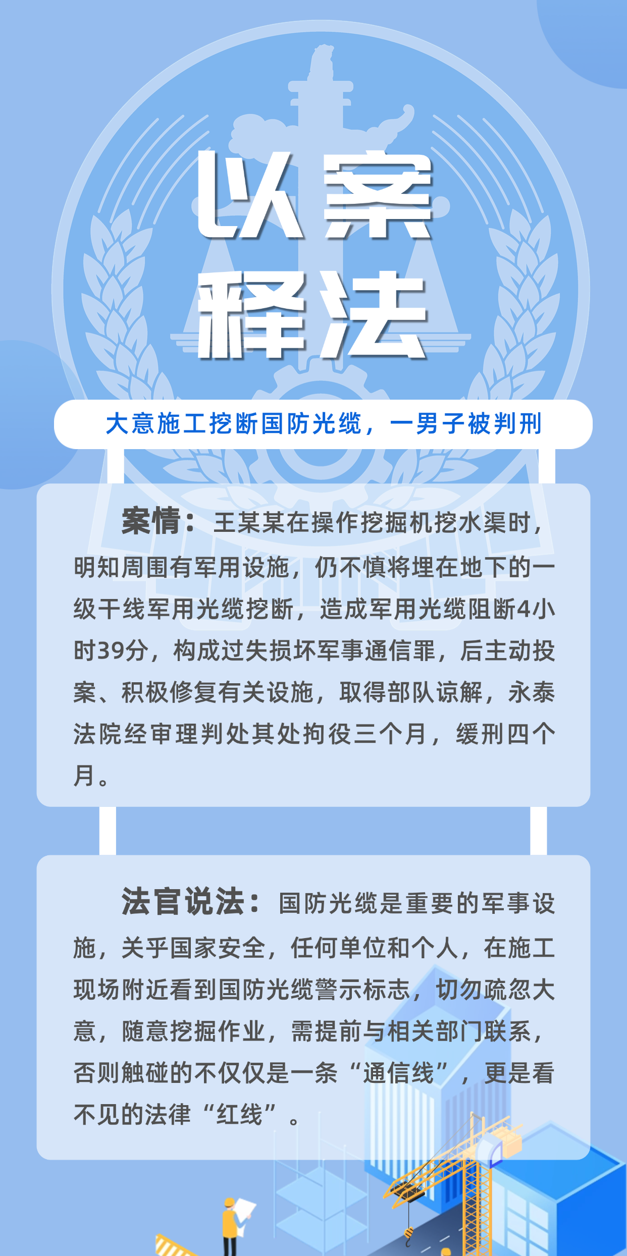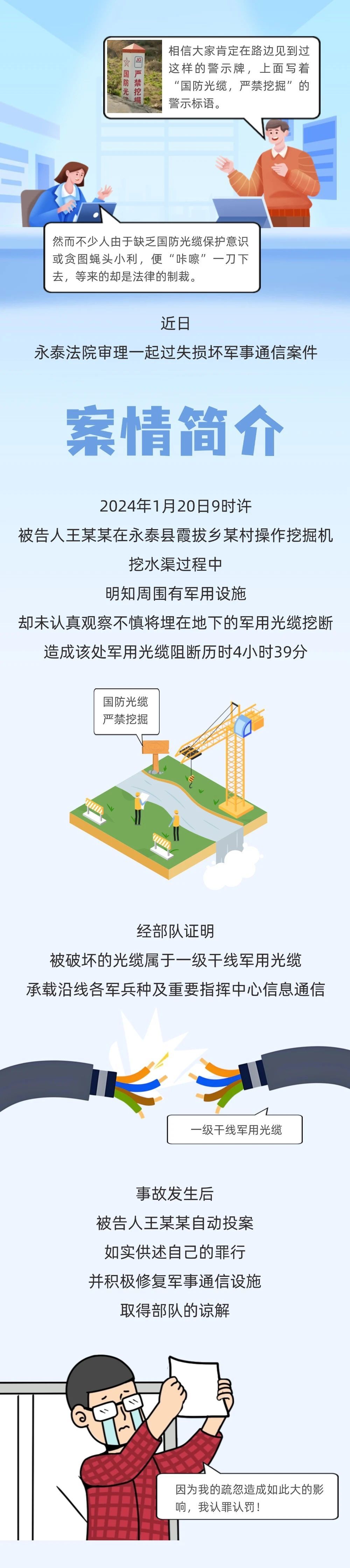永泰法院审理认为,被告人王某某过失损坏军事通信,造成一级干线军用光缆阻断达4小时39分,造成重要军事通信中断或者严重障碍,属于有关司法解释规定的“造成严重后果”的情形,构成过失损坏军事通信罪。综合考虑被告人自首、认罪认罚、积极修复损坏的军用通信设施、取得军事单位的谅解等情节后,判处其拘役三个月,缓刑四个月。