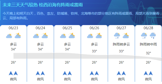 根据中国天气网信息显示,预计未来三天全区大部最高气温33~36℃,天气较热,桂西沿海有阵雨或雷雨。提醒大家,前期降水多,土壤水分饱和,短时间内强度大的阵雨或雷雨致灾风险依然较高,仍需继续提高警惕、防汛防灾。