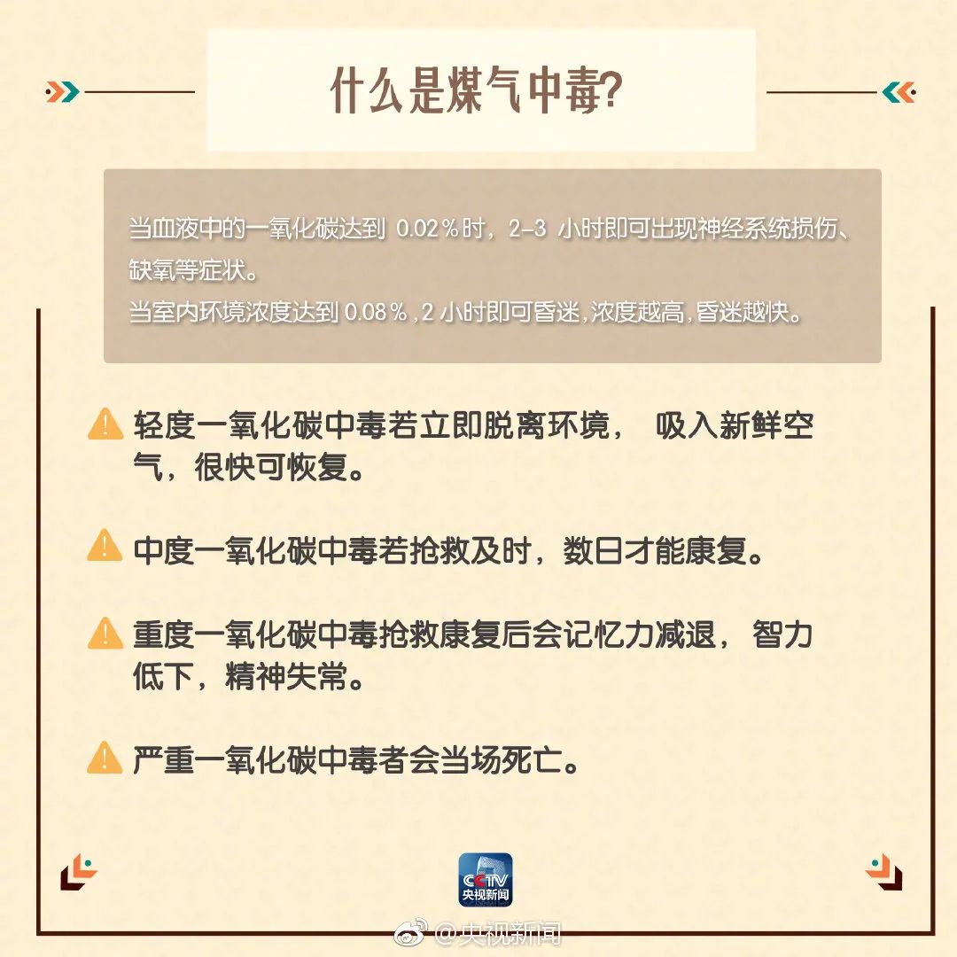 出现头昏等不适情况,要高度警惕,第一时间到室外透气、开窗通风;如长时间无缓解,迅速送医治疗。