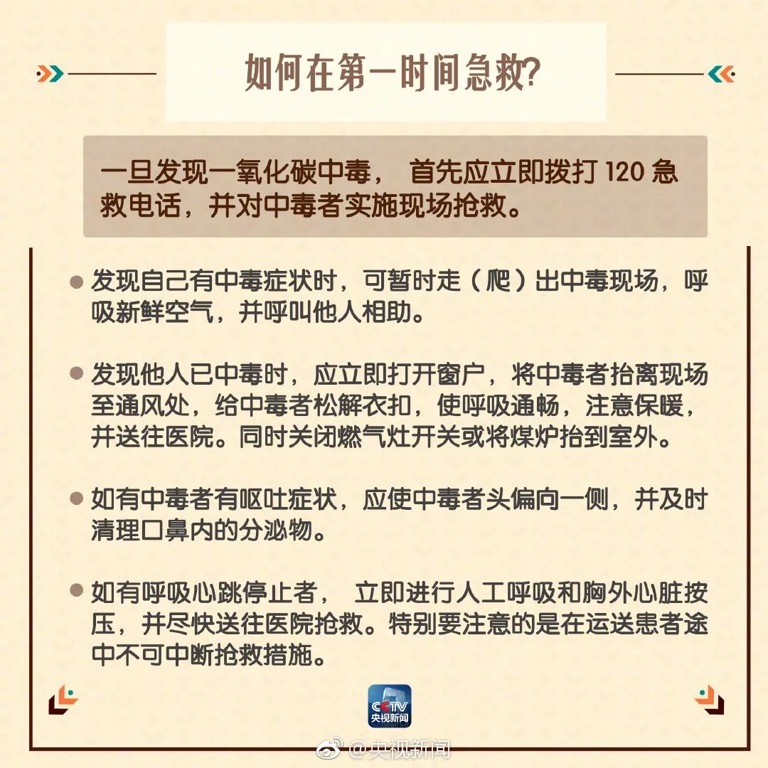 发现有一氧化碳中毒迹象,要第一时间开窗通风、转移到室外透气,进行心肺复苏,迅速拨打120急救,防止救治不及时导致伤亡。