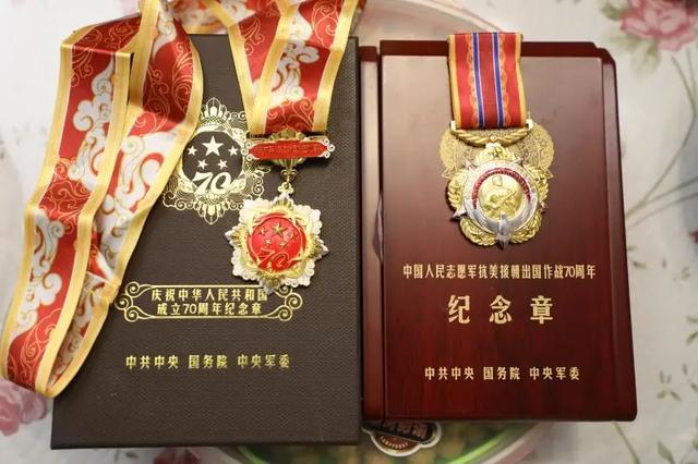 图为陈并生精心保留的庆祝中华人民共和国成立70周年纪念章、中国人民志愿军出国作战70周年纪念章。