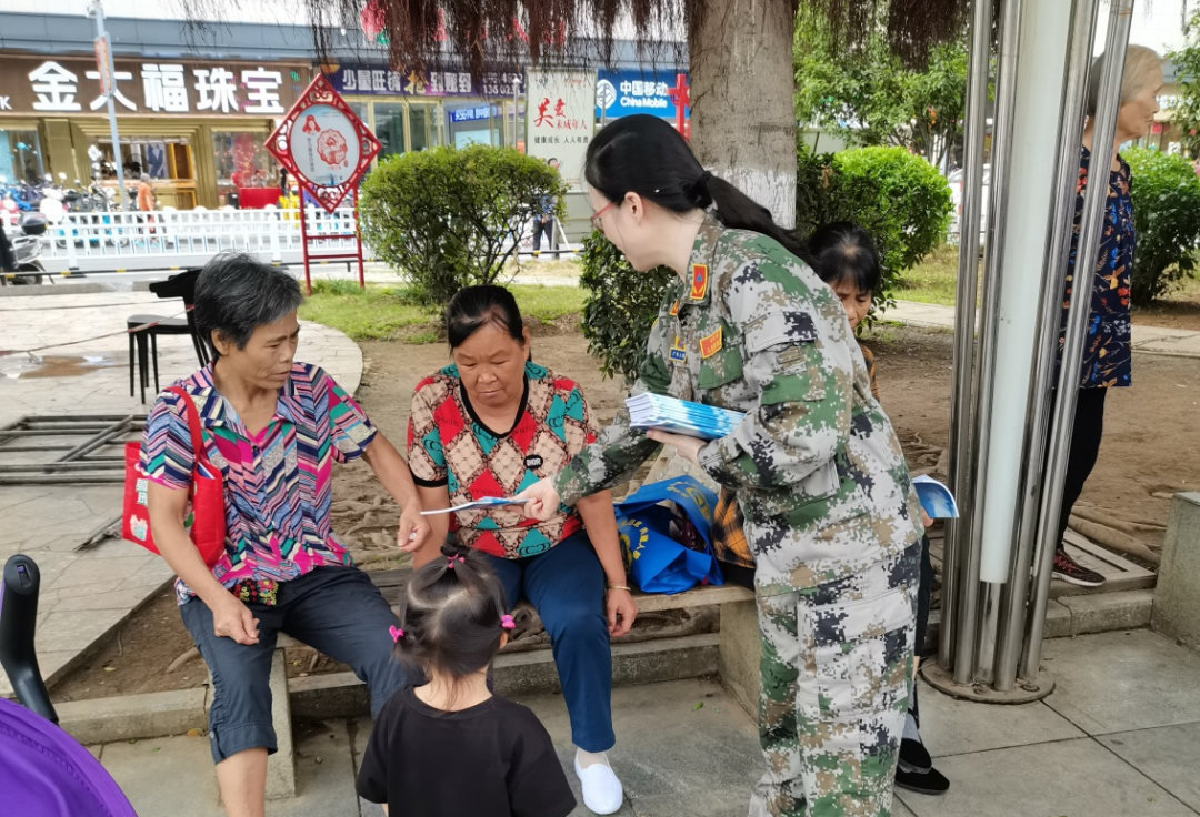 图为来宾市人防办工作人员在迎宾广场发放人防宣传手册