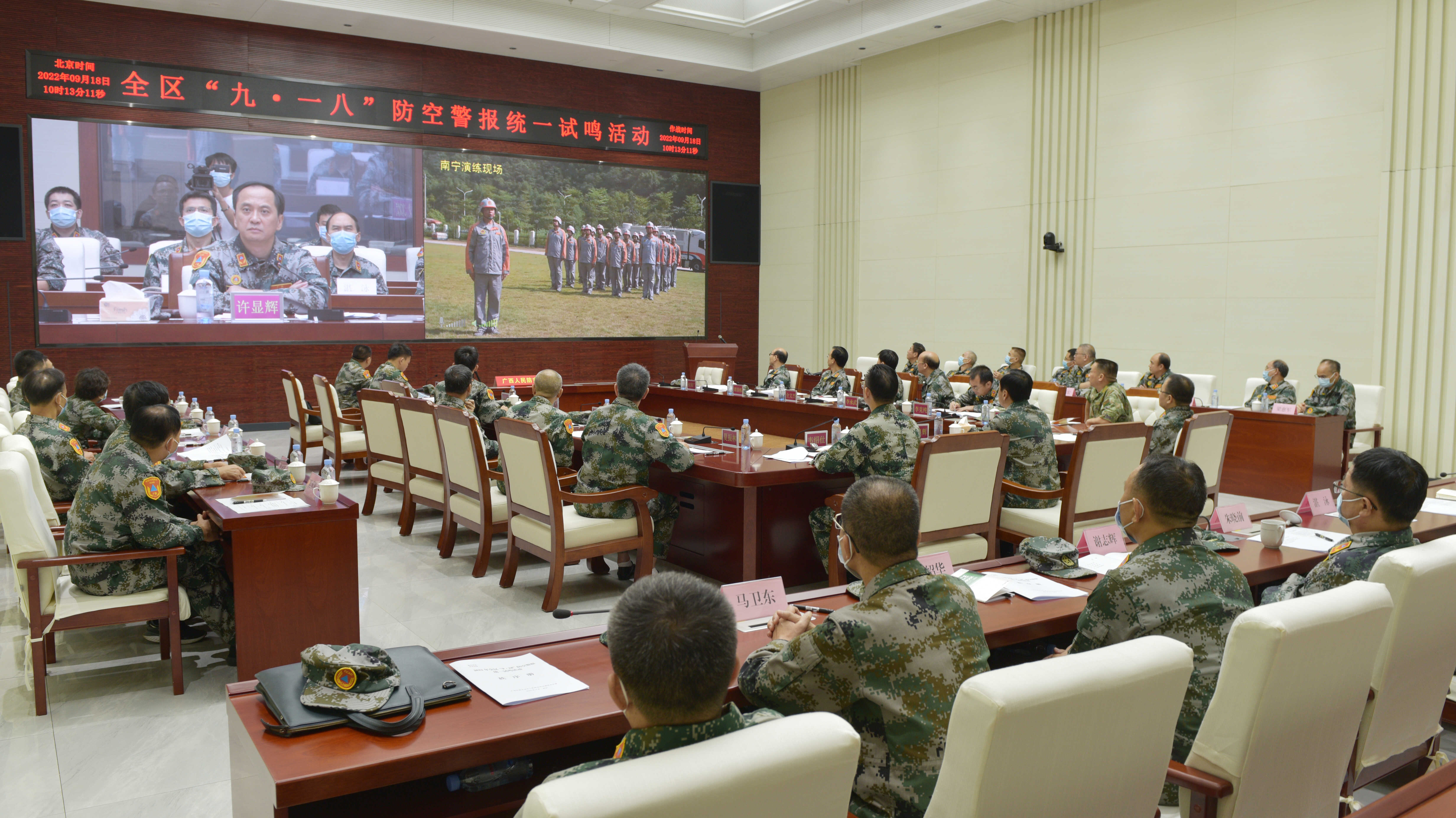 上午10时,许显辉下达“2022年全区“9·18”防空警报统一试鸣活动正式开始”命令。全区1991台防空警报器同时鸣响,按规定依次发放预先警报、空袭警报和解除警报信号,肃穆低沉的防空警报声响彻八桂大地。