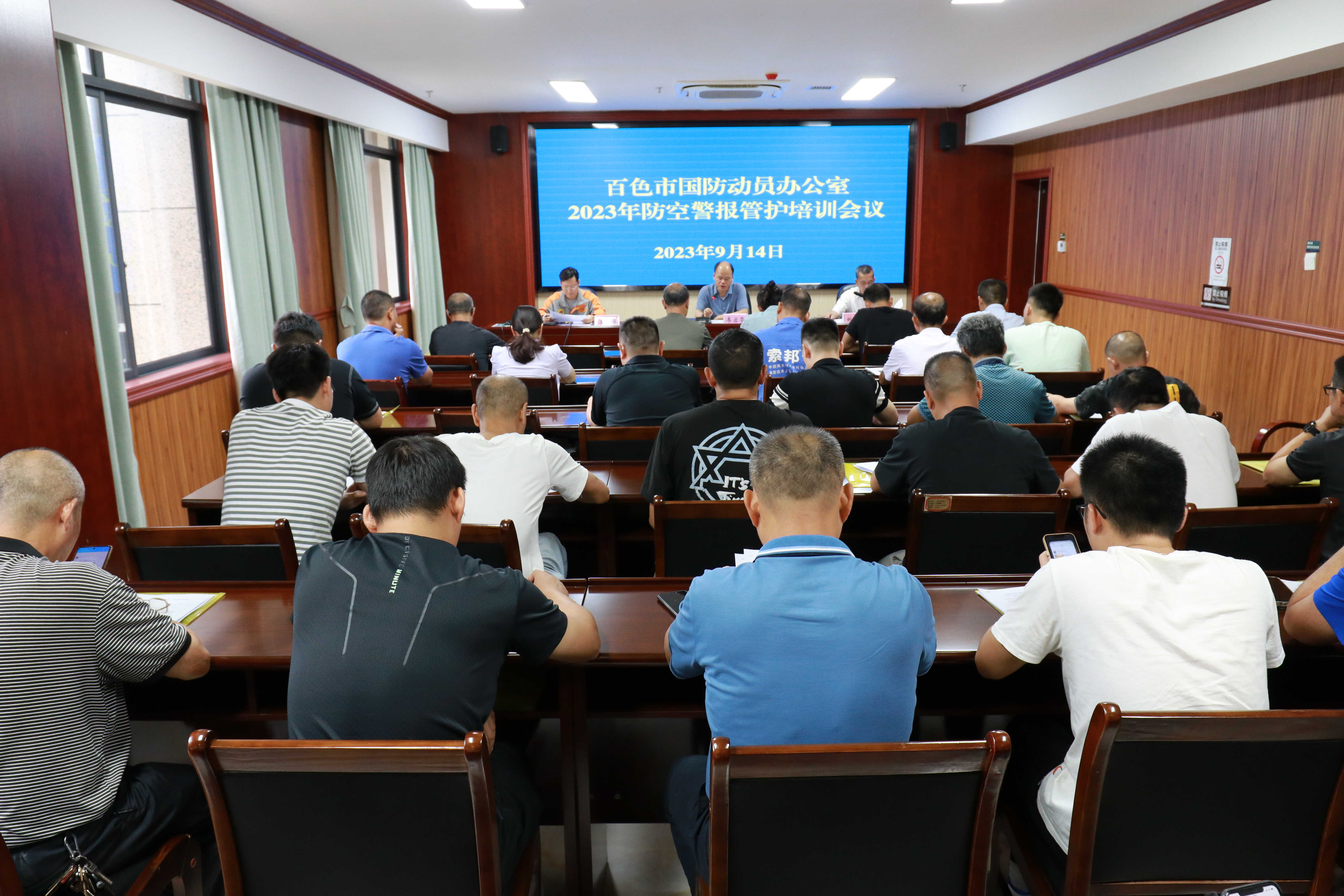 9月14日,百色市国动办召开2023年防空警报管护培训会议,50余名防空警报管护员参加。